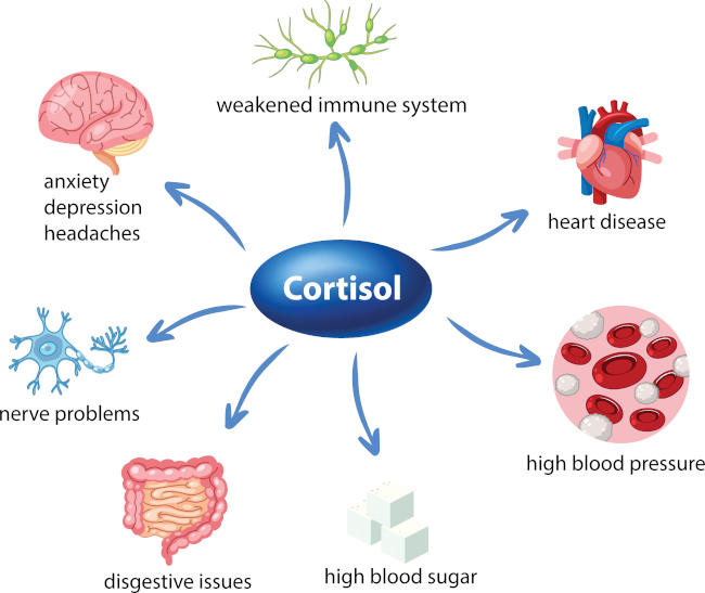 Un ipercortisolismo può difatti provocare : aumento della pressione sanguigna, aumento del grasso ed abbassamento della sensibilità insulinica, debolezza muscolare, calo della libido, calo motivazionale e in alcuni casi depressione, cefalea e senso di stanchezza e malessere generico.
